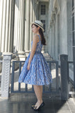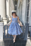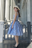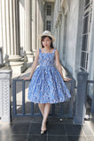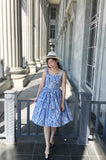 This square neck lined porcelain print dress comes decorative buttons in front, two hidden pockets and a concealed zipper at the back.