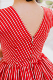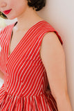 Classy and timeless would be the words used to describe this V neck vintage inspired dress that was slightly tweaked from its original 1950s pattern. Here's the red version in thinner stripes.