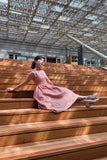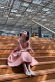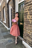 Valentine has a Sabrina neckline, back zipper, full skirt and comes with bows on the shoulders as well as pockets.