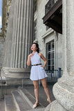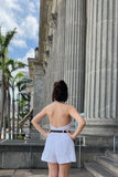 A classic white halter dress with a twist as it is actually a 2-piece playsuit with skirt.